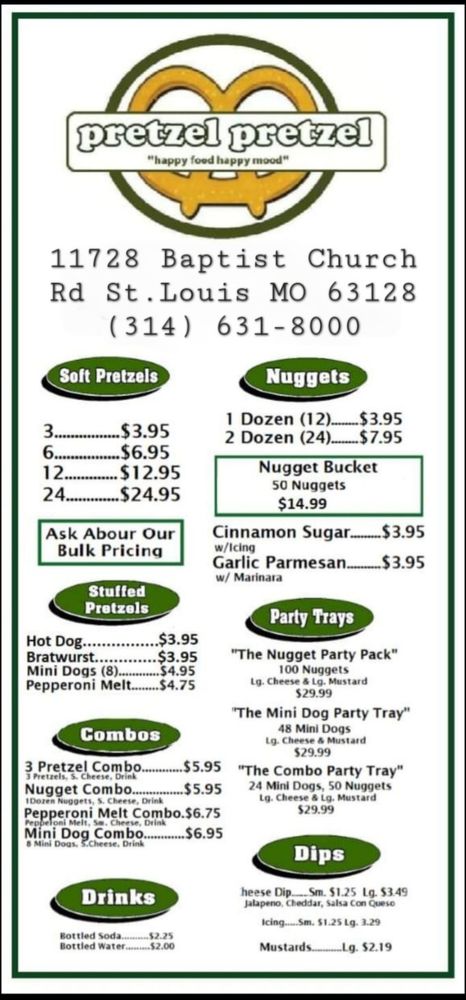 Welcome to Philly Pretzel Factory St. Louis, a must-visit spot for pretzel enthusiasts! Located at 11728 Baptist Church Rd, this takeout establishment boasts a tantalizing array of pretzel delights. Their menu features soft pretzels at $3.95, which are perfectly baked and incredibly soft, making for a delightful snack. For those looking to indulge, the Stuffed Pretzels are a crowd favorite. Options like the Pepperoni Melt Pretzel and the hearty Bratwurst Pretzel promise a burst of flavor in every bite.